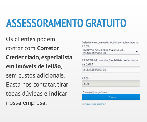 | Assessoria Gratuita: | Você sabia? Nossa assessoria é 100% gratuita para todos os imóveis Caixa, independente do leiloeiro! É só indicar o CRECI Jurídico 8926 na hora da proposta / Homologação. Peça o no WhatsApp ao lado. |